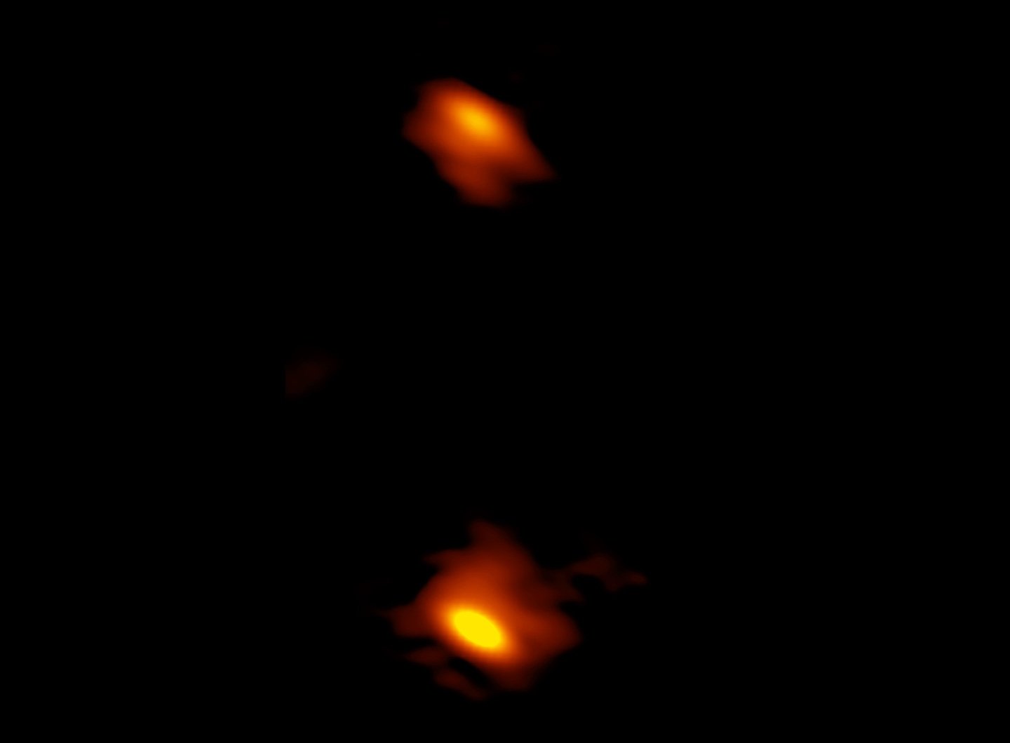 This image, taken by the Very Long Baseline Array (VLBA), shows two supermassive black holes, which appear as the blobs with red strips. The black holes are in the center of an elliptical galaxy. Colors represent different spectral slopes in radio emission, with red showing the most dense regions surrounding the black holes. The black hole on the right has likely recently devoured a massive star, which caused it to shoot out two ultrafast jets. The ends of those jets appear as green blobs above and below the black hole. This object, called J0405+3803, is referred to as a Compact Symmetric Object (CSO), because its jets are relatively close-in (or compact), compared to other black holes with much larger jets.