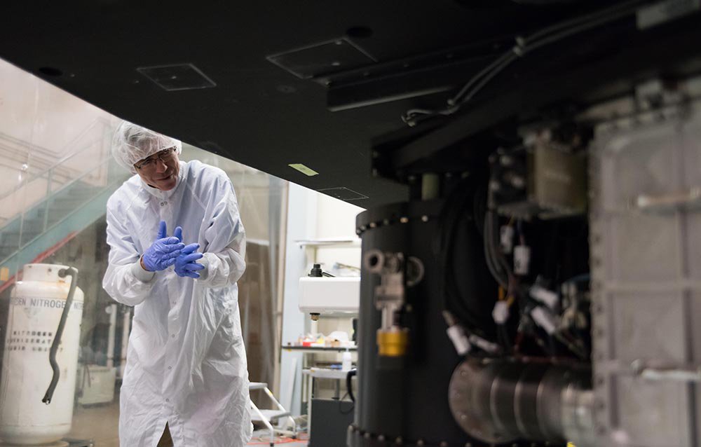 Chris Martin, the principal investigator of the Keck Cosmic Web Imager, inspects the instrument in a clean room at Caltech.