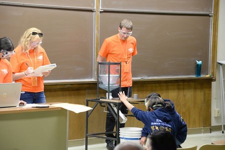 Caltech Freshman Shweta Dutta, Science Olympiad collaborators Amanda McDonald and Kevin Lemen supervising the participants from Kraemer Middle School in the bridge building events where participants build the lightest bridge that can hold 15kg of sand.
