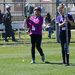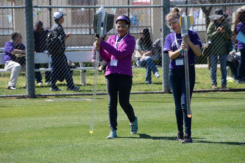 Participants from Lincoln STEAM Academy bringing their bottle rockets to the launcher powered by pressurized water and air. The goal of this event is to keep the bottle rocket in the air as long as possible while protecting the egg secured to the top compartment of the rocket.