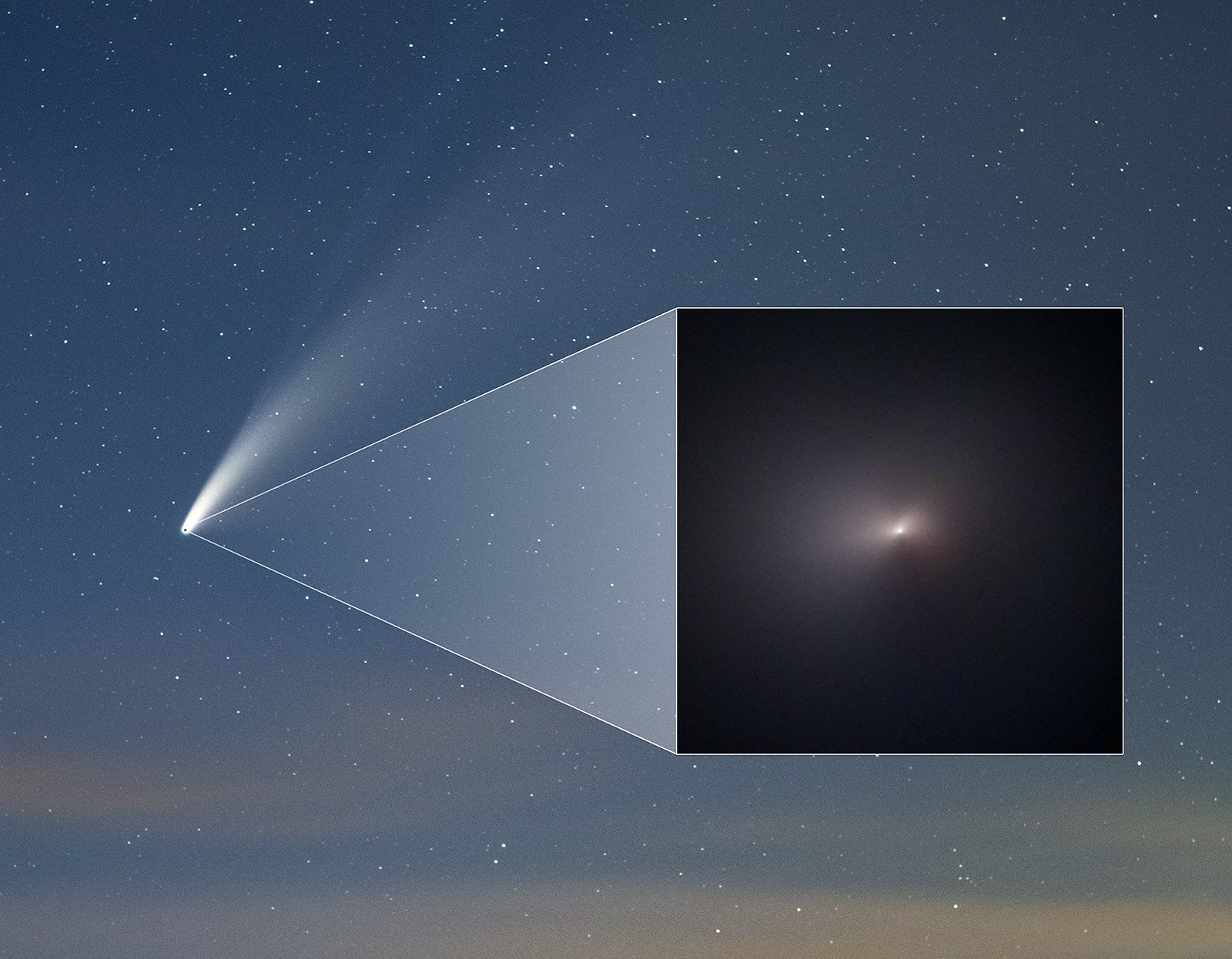This ground-based image of comet C/2020 F3 (NEOWISE) was taken from the northern hemisphere on July 18, 2020. The inset image, taken by the Hubble Space Telescope on August 8, 2020, reveals a close-up of the comet after it passed by the sun. Hubble's image is centered on the comet's nucleus, which is too small to be seen, as it is estimated to measure no more than 3 miles (4.8 kilometers) across. Instead, the image shows a portion of the comet's coma, the fuzzy glow, which measures about 11,000 miles (18,000 kilometers) across in this image. Comet NEOWISE will not pass through the inner solar system for another nearly 7,000 years.