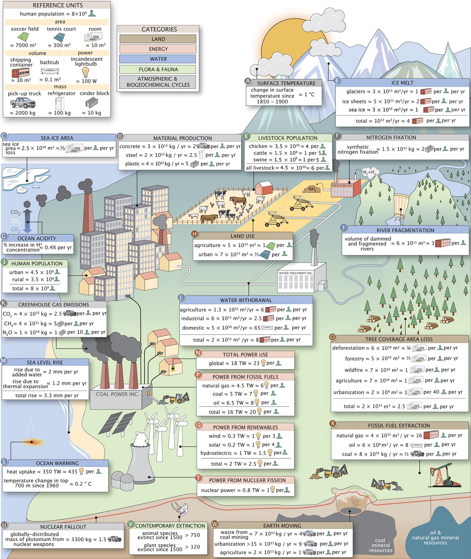 An infographic illustrating various numerical values relevant to the human impacts on the environment. Click the magnifying glass icon in the lower right to zoom.