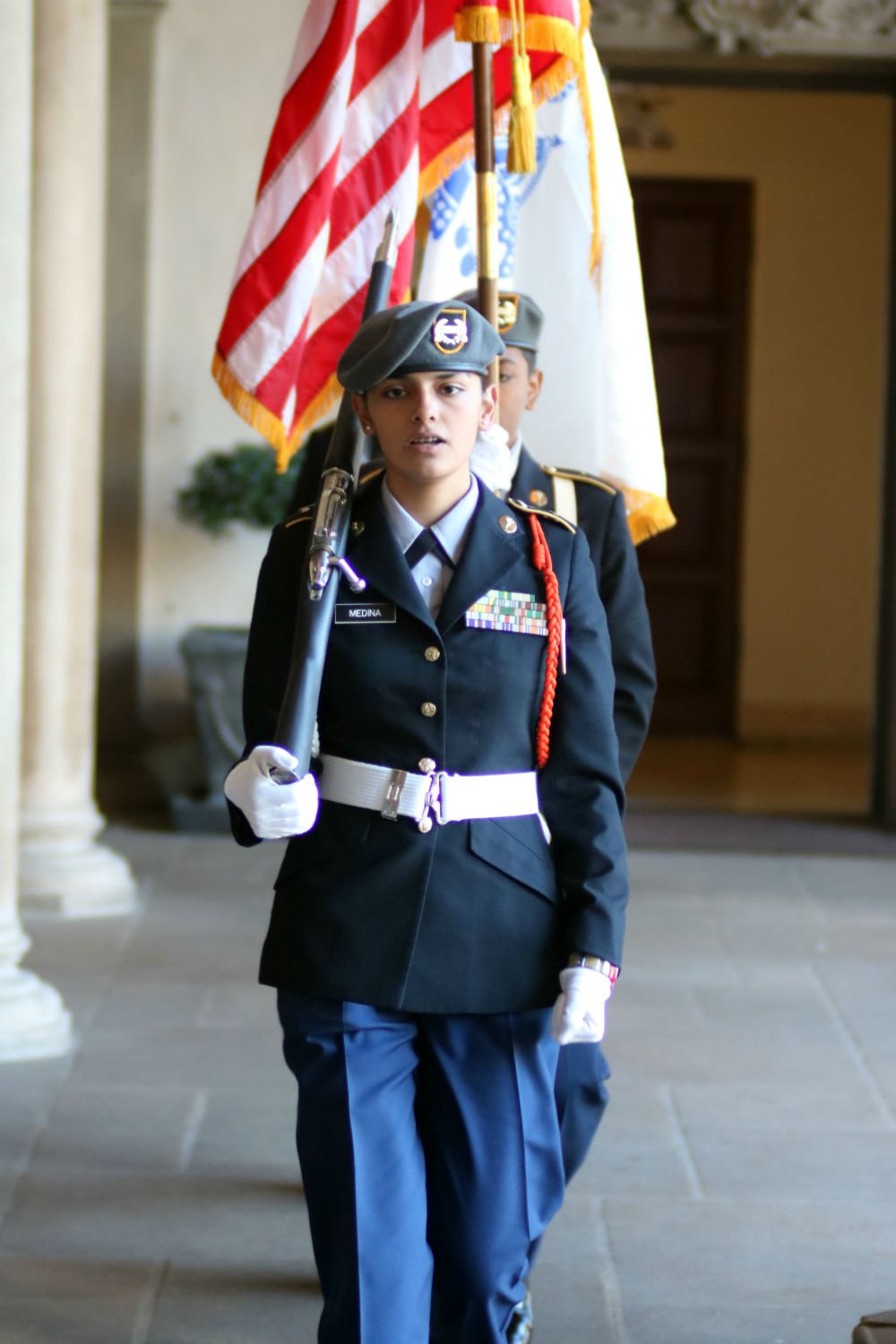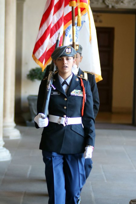 A color guard of students from Blair High School's Junior ROTC program enter the Athenaeum at the start of the Veterans Day event.