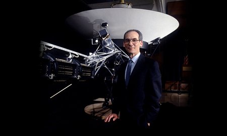 Caltech's Ed Stone stands before a model of the Voyager spacecraft