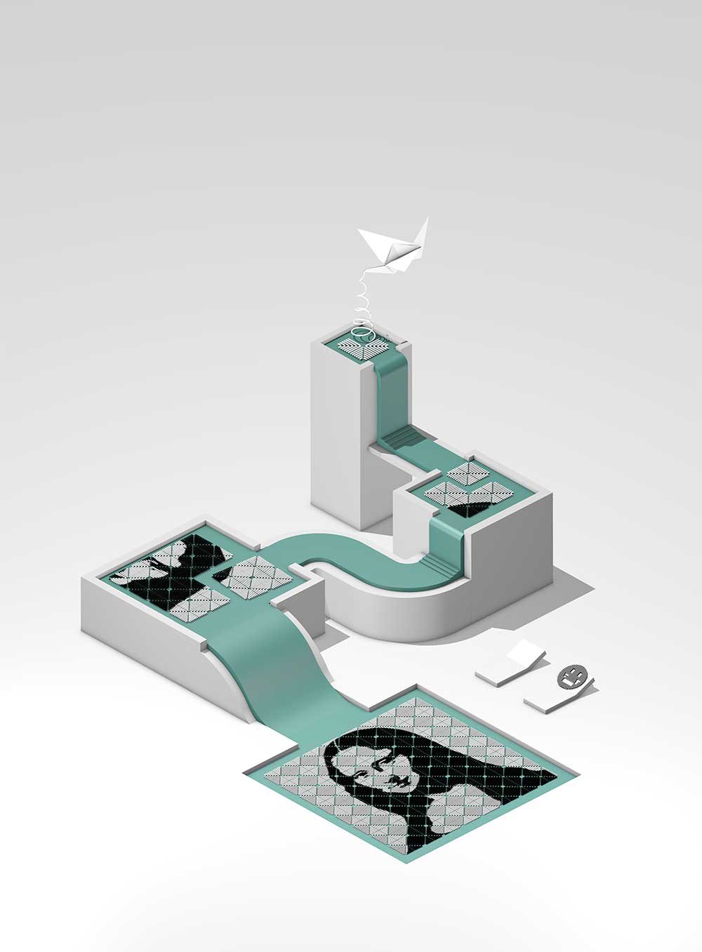 Conceptual illustration of DNA origami tiles self-assembling into a life-size portrait of a bacterium.