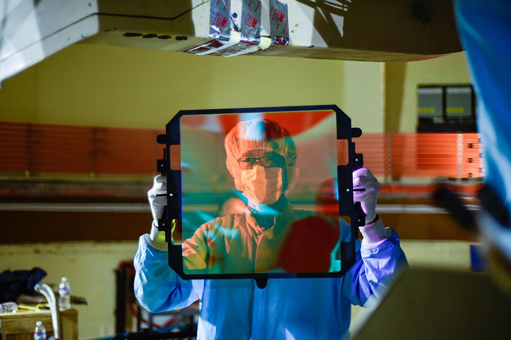 Technical lead Roger Smith, of Caltech Optical Observatories, inspects one of the three wide-field optical filters used for the Zwicky Transient Facility (ZTF) science survey.